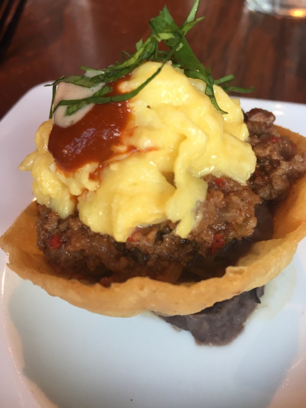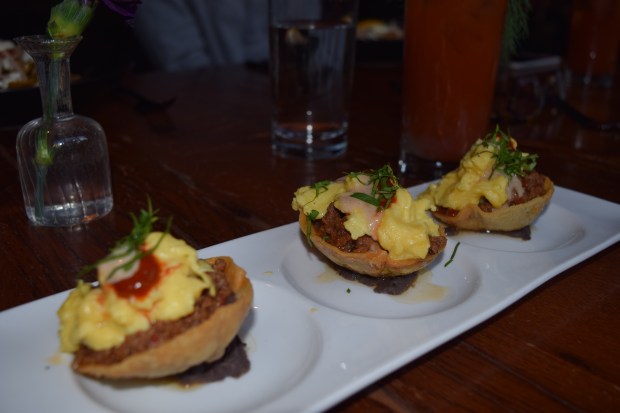The brunch menu was just as interesting as the atmosphere. It seems like the restaurant tries to add fancy twists to some classic eats, while also trying to show off some innovative plates. I ended up getting the Chile Nogado ‘Rancheros Huevos Style’ (the mini taco-like dish with the three tortilla shells) Christy got the Chile Cheese Toast (they have the three tiny quail eggs on top) and both Austin and Ben got the Chilaquiles (the bowl with the egg, steak and tortilla chips). I definitely didn’t hate my meal, but unfortunately I can’t recommend Vandal as the best brunch I’ve ever had. Part of me thinks the kitchen, lead by celeb chef Chris Santos, is trying a little too hard to make the menu “different”. Sometimes less is more! That’s just my two cents, though. That being said, I would love to check out the lounge beneath the restaurant. The entrance is at the bottom of the spray painted steps. You can’t tell by looking at them, but the words spell out the lyrics to “New York State of Mind” by Billy Joel. Pretty cool! They’re definitely the restaurant’s staple design. The entrance to Vandal itself is also through a flower shop, which I thought was pretty cool (after we managed to get inside the place). So my final thoughts on Vandal: go for the atmosphere, not the food! Do you have a favorite brunch spot? Leave a comment and tell me about it!