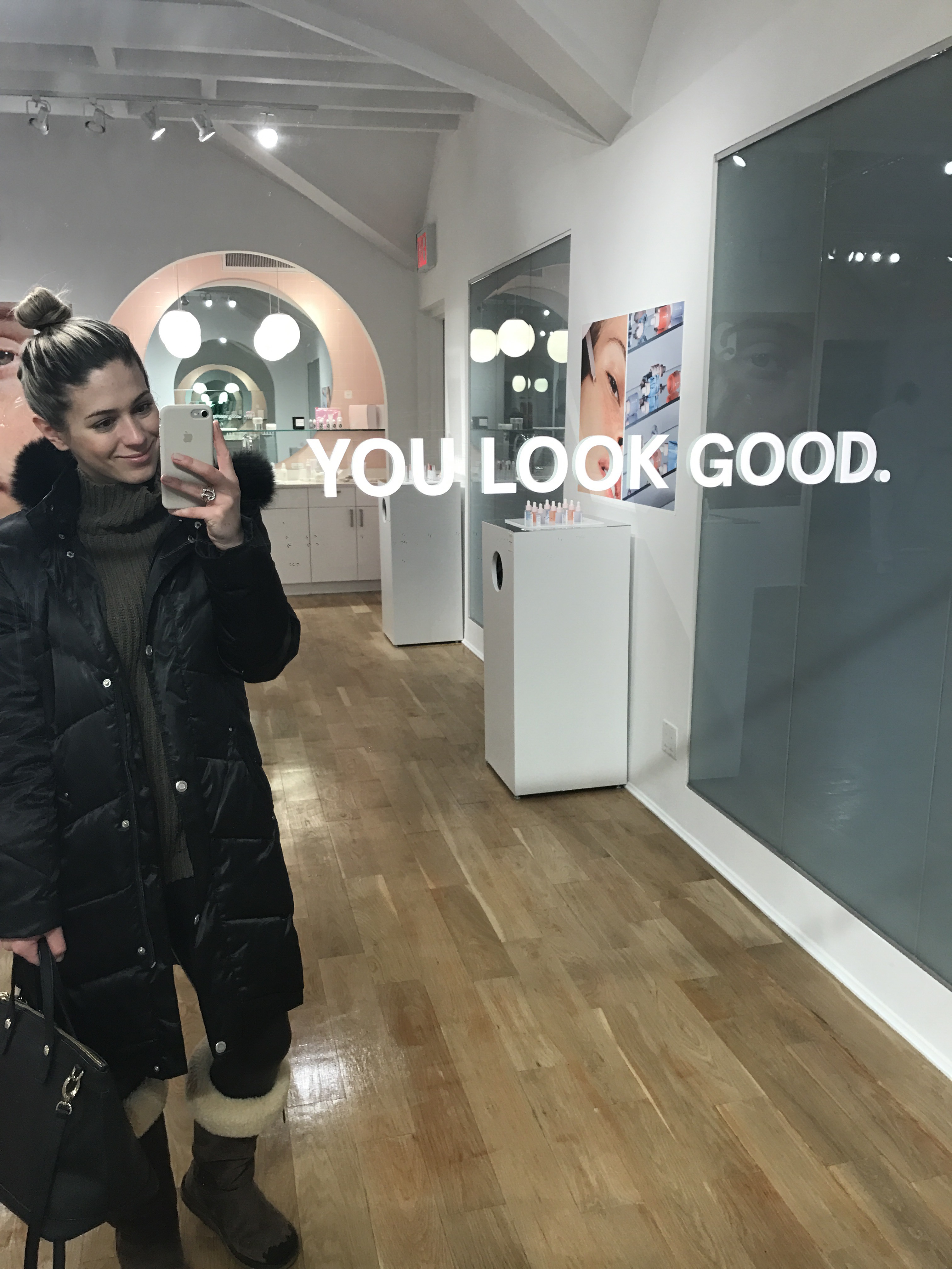 So, back to this euphoria of a showroom. A lot of thought undoubtedly went into the design. From the “JUST DEW IT” and “MAKE GOOD CHOICES” on the walls to the marble and quartz skincare display, the layout is sophisticated and all around remarkable. You definitely can’t pass up taking a picture in front of the mirror, which has “YOU LOOK GOOD” written on it. Thanks for the positive vibes, Glossier gang!