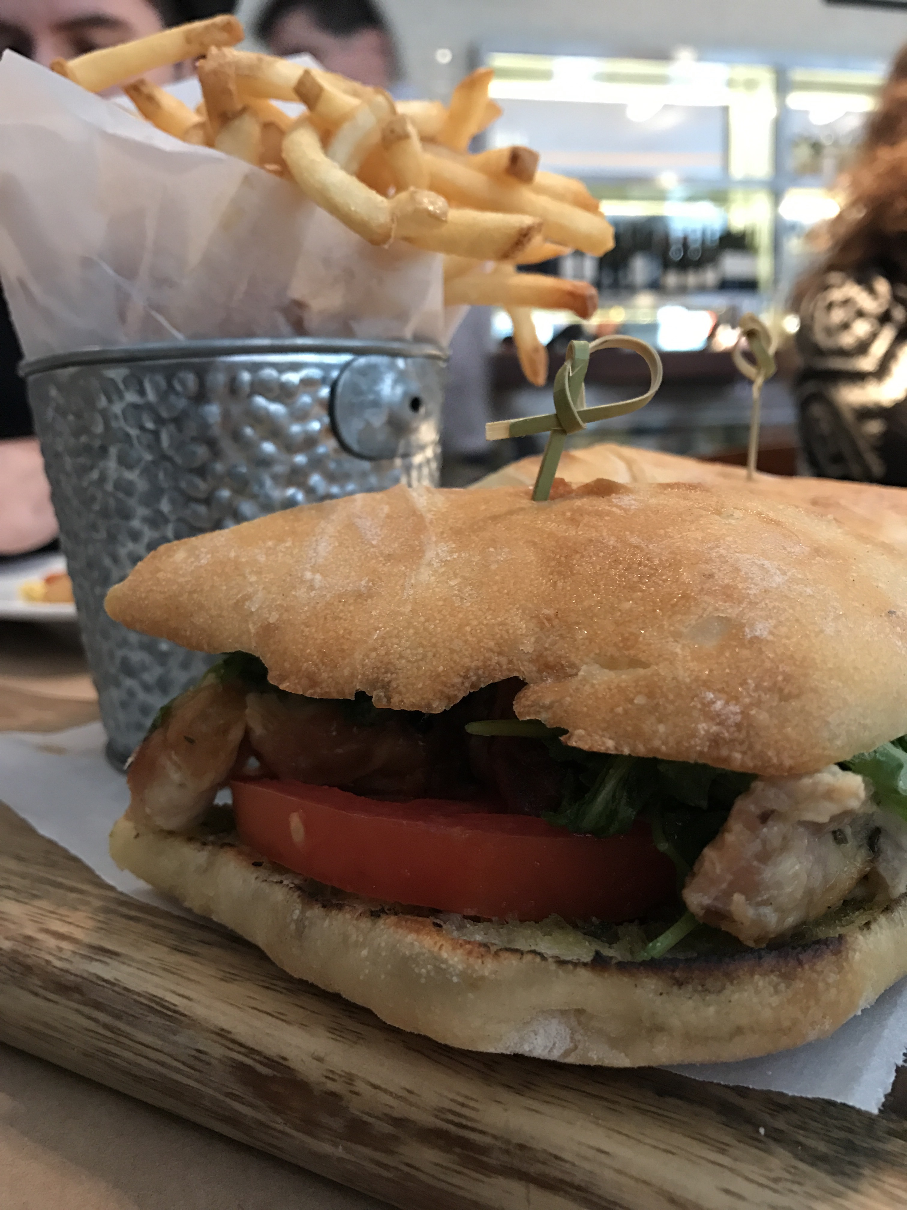 Ben went the brunch route and got the Delicatessen Scramble, which was scrambled eggs mixed with smoked Scottish salmon and caramalized onions. I ended up getting the Award Winning Pan Roasted Chicken Thigh Sandwich, with had olive pesto, sweet pepper aioli, burrata cheese & fries. I’m not the biggest chicken thigh fan, but this sandwich was pretty damn good. The cheese and the aioli were my favorite: they were perfect together. If I ever go back, I’ll definitely try the Texas Benedict on the brunch menu, though. Someone at a table near the front door had it and it looked AMAZING. It’s basically a cookout meets traditional eggs Benedict experiment: poached eggs, hollandaise sauce and pulled pork all set on top of brioche bun french toast. Yum!