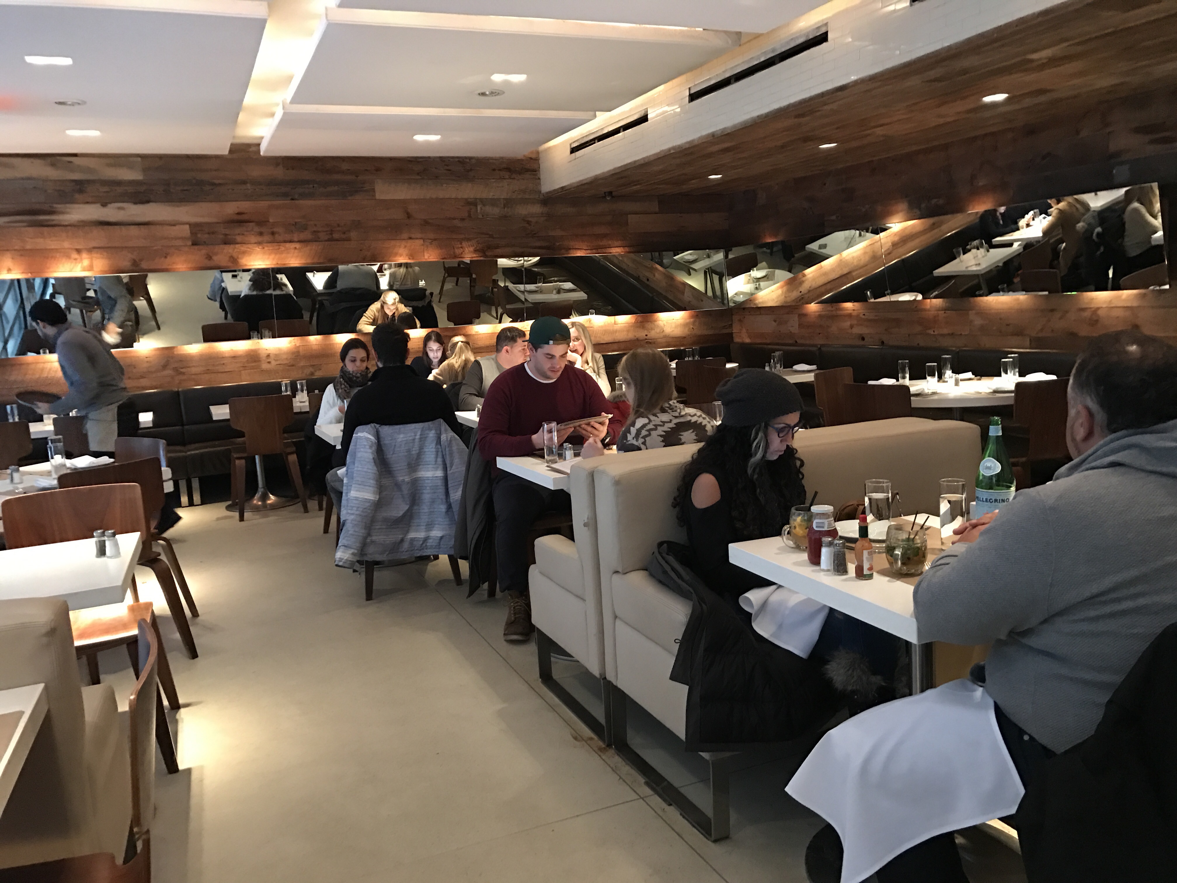 First of all, the environment is really cool. There’s a massive glass wall on one side of the restaurant and below the wall is a glass ceiling that creates a nice lounge area. I was able to watch the snow fall through the glass from my seat on the other side of the restaurant. Delicatessen has a huge bar and tons of seating, though some of the tables are really close together (not anything out of the ordinary for NYC, though!)