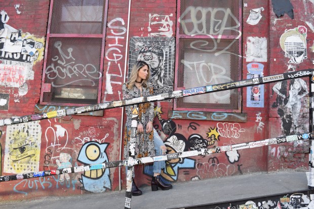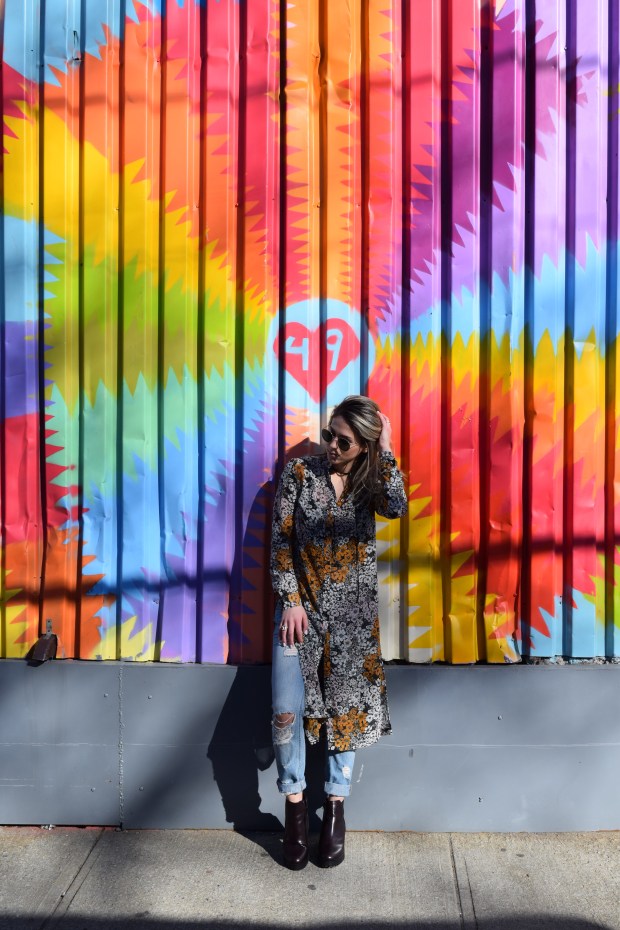 That floral tunic is gorgeous and I love how your paired with the denims and boots. Love all the graffiti – great shots! Xx