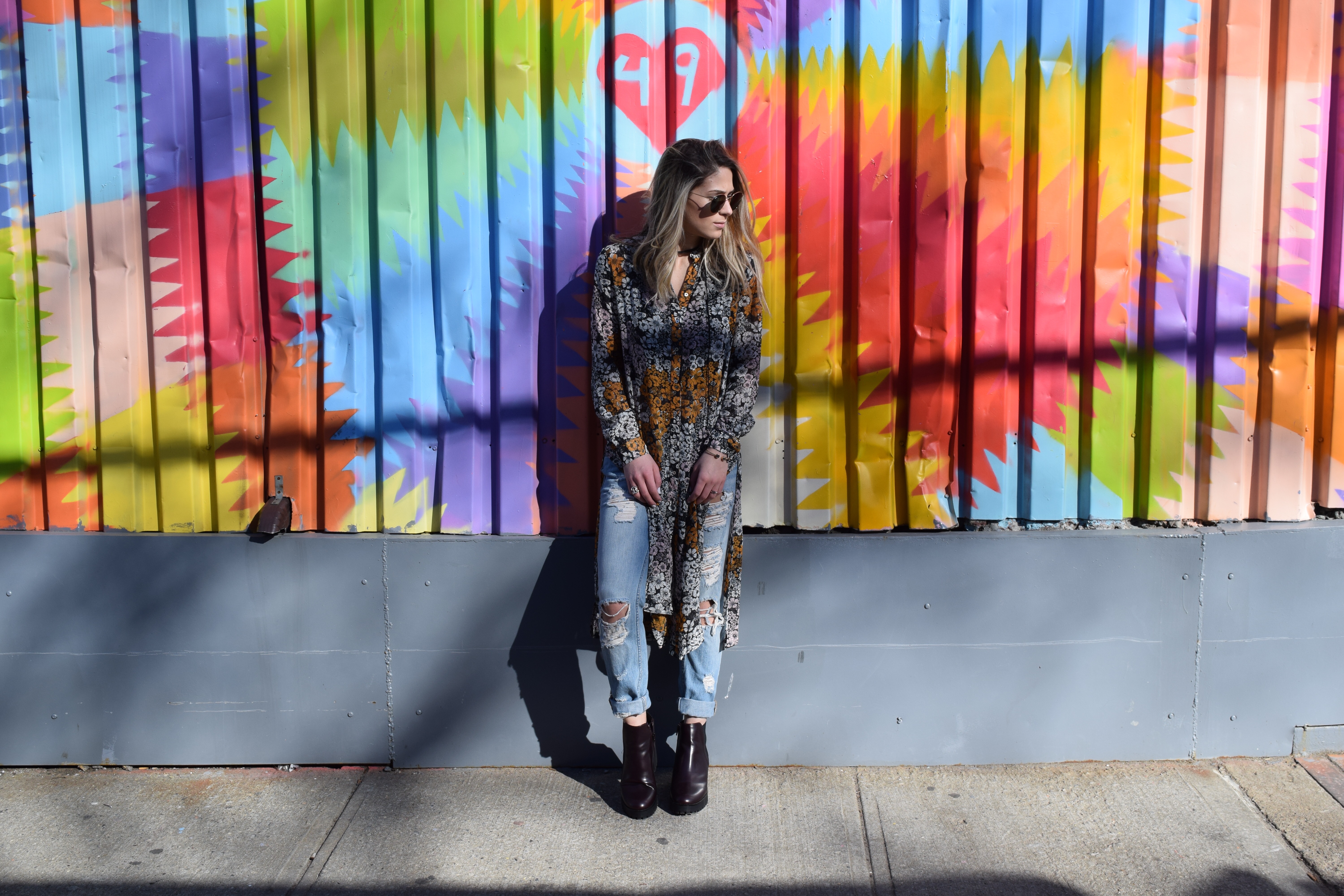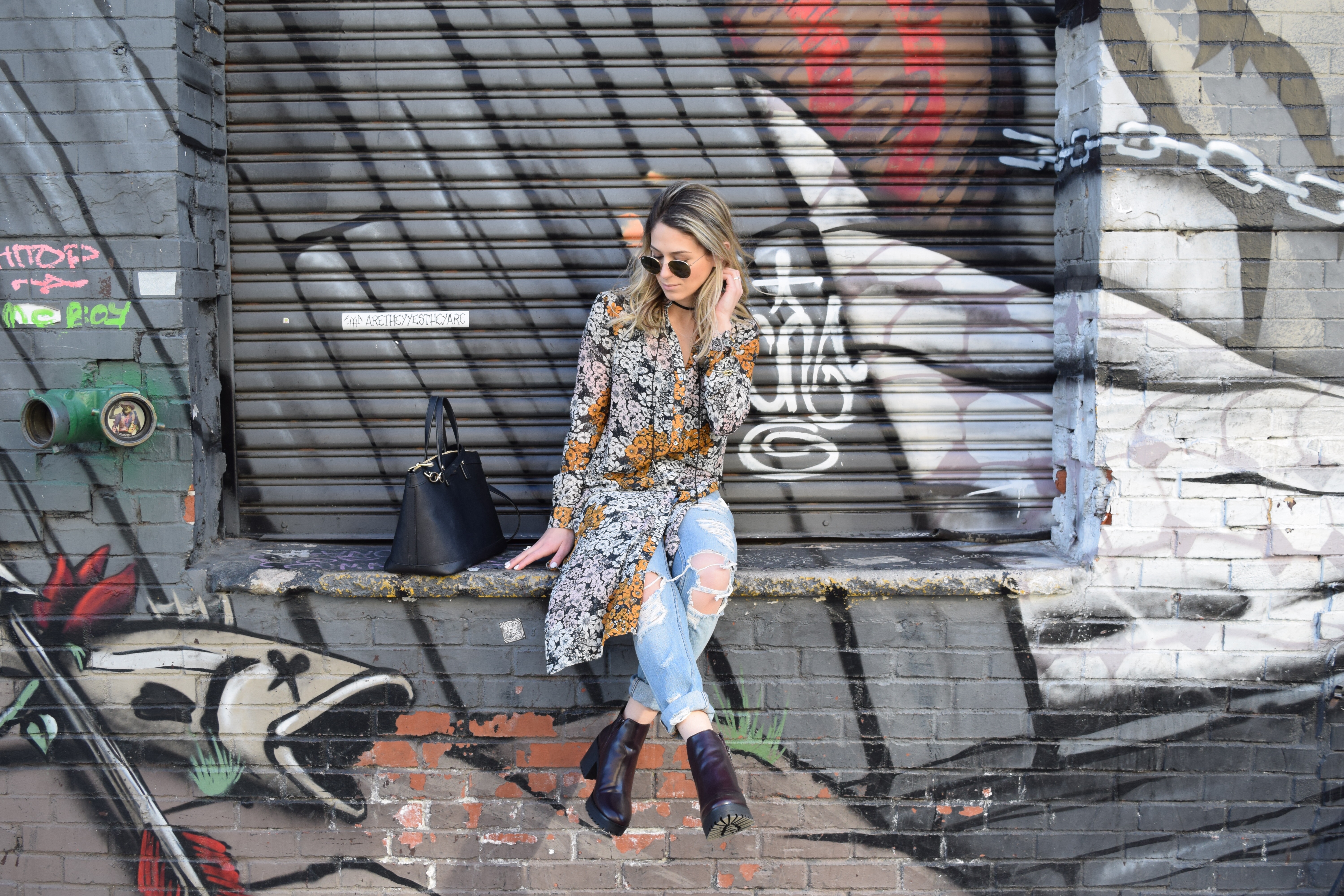That floral tunic is gorgeous and I love how your paired with the denims and boots. Love all the graffiti – great shots! Xx