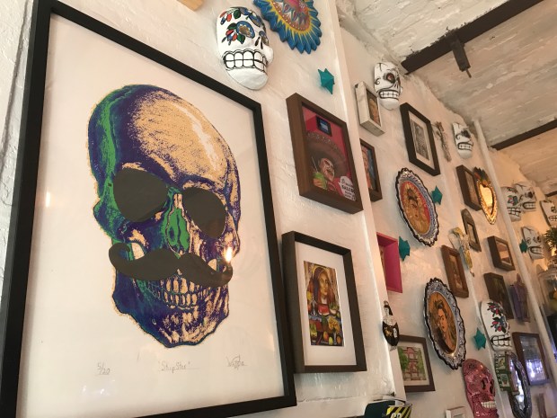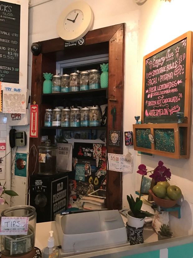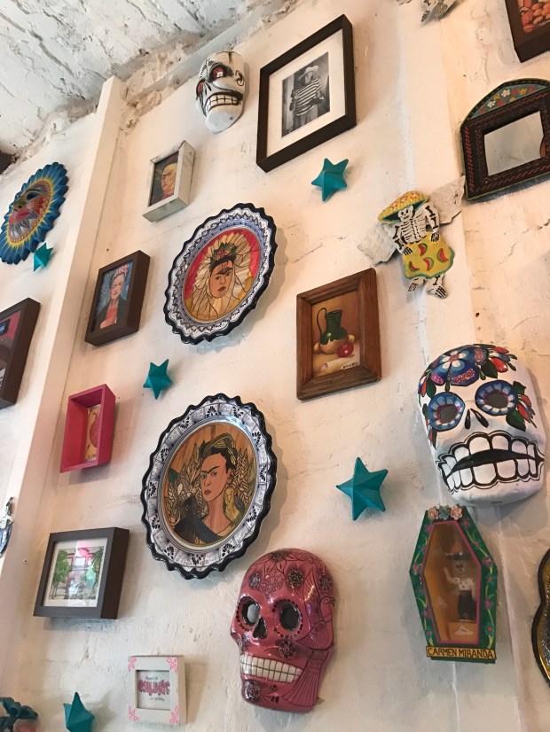 Salud means cheers, which we all know. It’s also another way of saying ‘gesundheit’. The best definition of ‘Salud‘, however, is the tiny, aesthetically pleasing, incredibly healthy and organic juice shop / Latin American restaurant in SoHo. Sounds like an odd combination, right? Well, wrong. I paid this family owned joint a visit this weekend and I was really blown away. The first things that struck me were Dia de Los Muertos inspired decorations. One wall of the restaurant, which only has 2 tables and a bar with aqua colored stools, was covered with colorful skulls and portraits of the renowned Mexican painter Frida Kahlo. It’s really an incredible sight and my pictures really don’t do the arrangement justice! The woman who took my order was super helpful and kind. She suggested the Pitaya Bowl (I’m all about my Latin American food, but I desperately needed a refreshing kick to break through the grogginess) and the owner agreed that it was an awesome choice. It’s essentially the Salud twist on the traditional acai bowl (which they have, too!). It’s made with Pitaya purée, aka dragon fruit, and topped with fresh fruit slices. It was amazing. I was craving something healthy and that really hit the spot. I had it wrapped up to go and I sat on a bench outside of a park while I ate. I was so happy that they recommended it! The menu also features a ton of traditional dishes, like chicken torta and quesadillas. Like I said, everything is all natural and organic, which the owner reiterated when we chatted.