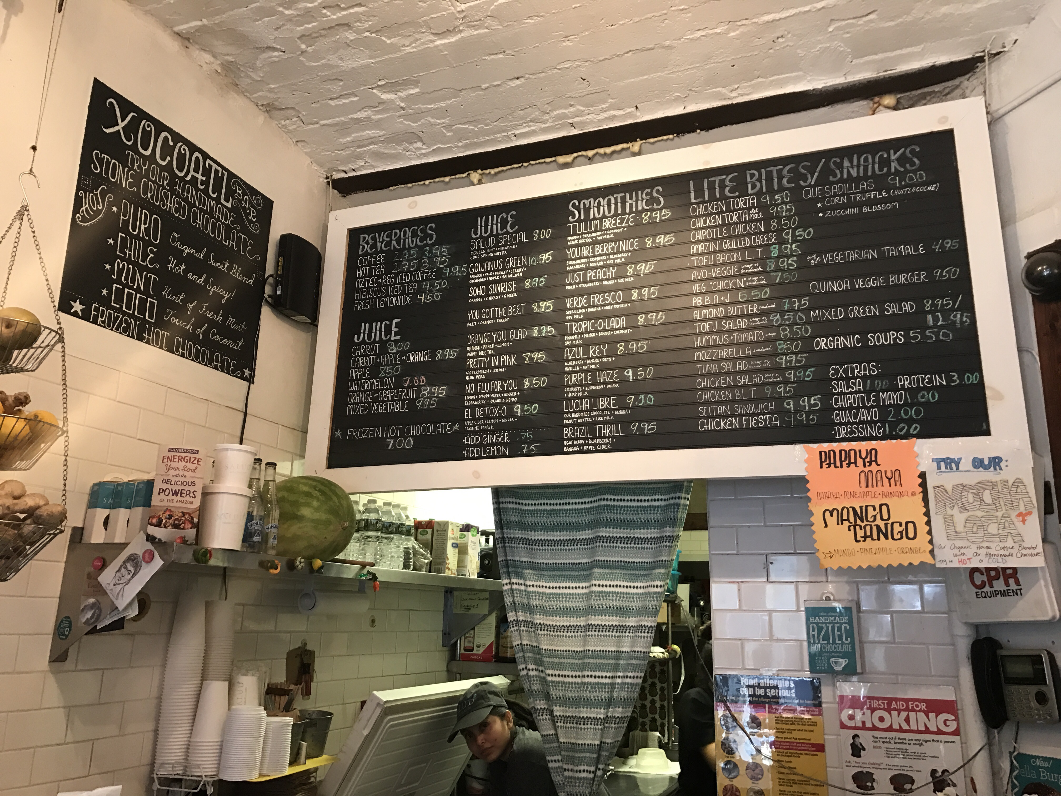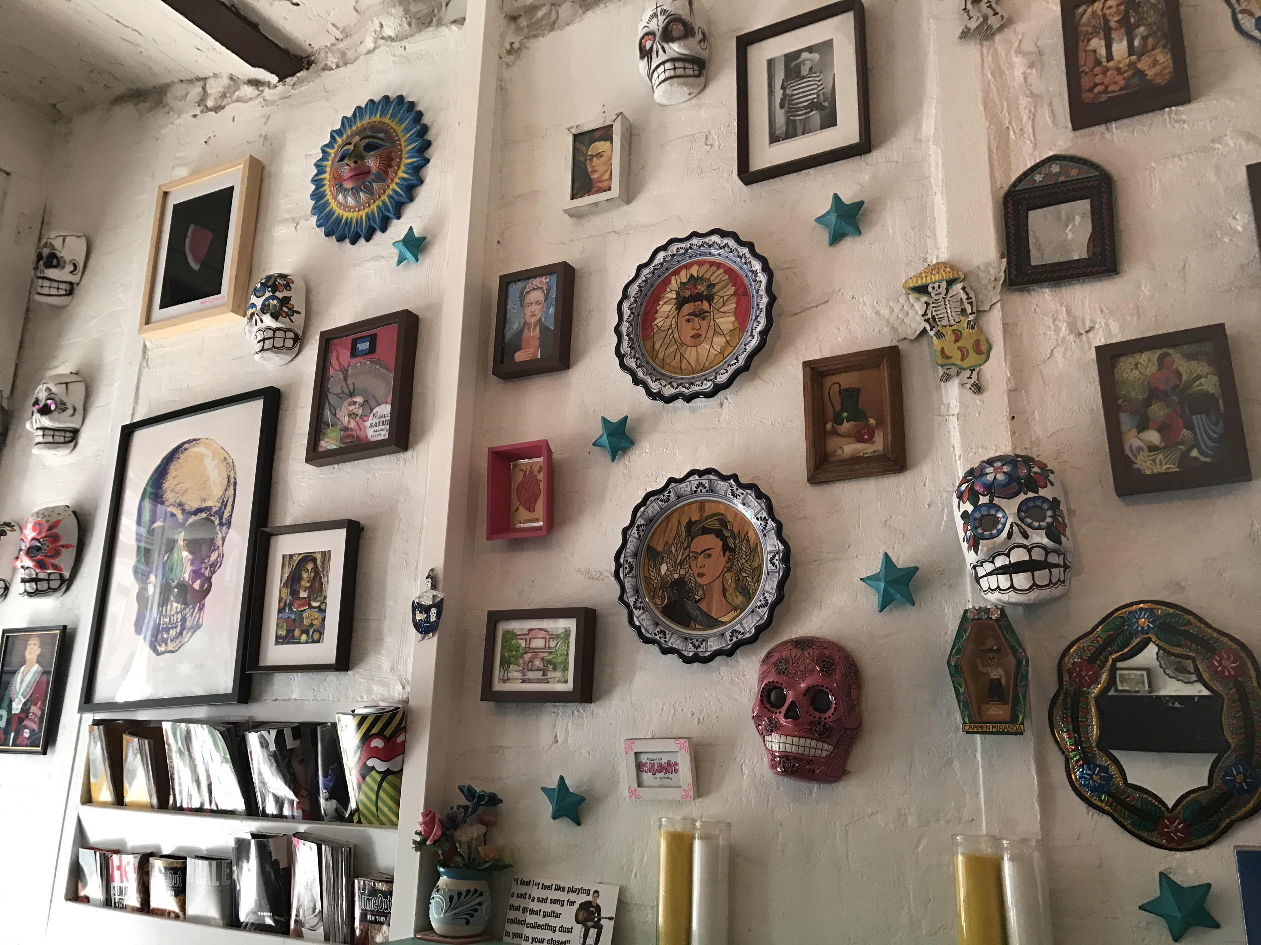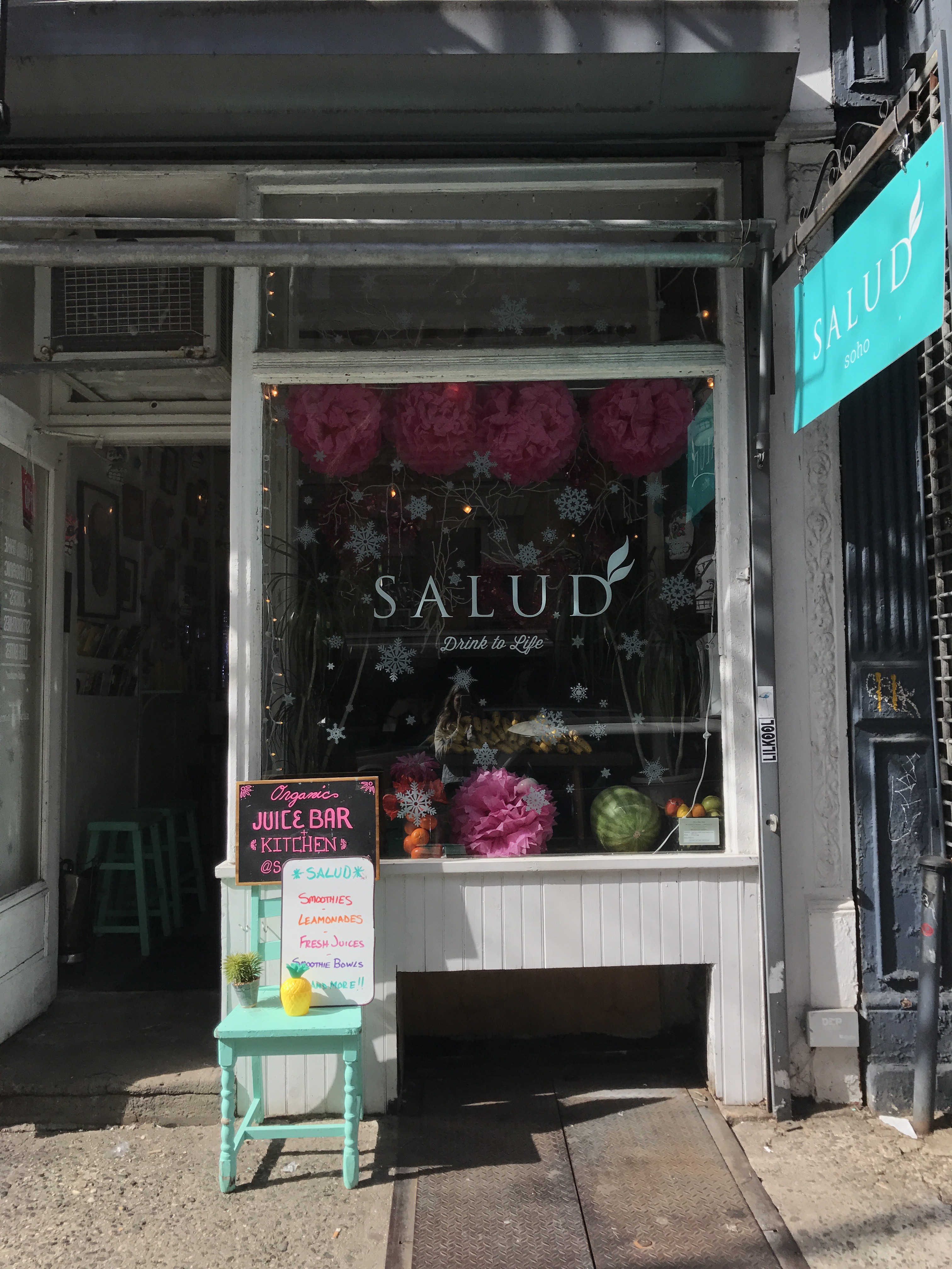 Salud means cheers, which we all know. It’s also another way of saying ‘gesundheit’. The best definition of ‘Salud‘, however, is the tiny, aesthetically pleasing, incredibly healthy and organic juice shop / Latin American restaurant in SoHo. Sounds like an odd combination, right? Well, wrong. I paid this family owned joint a visit this weekend and I was really blown away. The first things that struck me were Dia de Los Muertos inspired decorations. One wall of the restaurant, which only has 2 tables and a bar with aqua colored stools, was covered with colorful skulls and portraits of the renowned Mexican painter Frida Kahlo. It’s really an incredible sight and my pictures really don’t do the arrangement justice! The woman who took my order was super helpful and kind. She suggested the Pitaya Bowl (I’m all about my Latin American food, but I desperately needed a refreshing kick to break through the grogginess) and the owner agreed that it was an awesome choice. It’s essentially the Salud twist on the traditional acai bowl (which they have, too!). It’s made with Pitaya purée, aka dragon fruit, and topped with fresh fruit slices. It was amazing. I was craving something healthy and that really hit the spot. I had it wrapped up to go and I sat on a bench outside of a park while I ate. I was so happy that they recommended it! The menu also features a ton of traditional dishes, like chicken torta and quesadillas. Like I said, everything is all natural and organic, which the owner reiterated when we chatted.