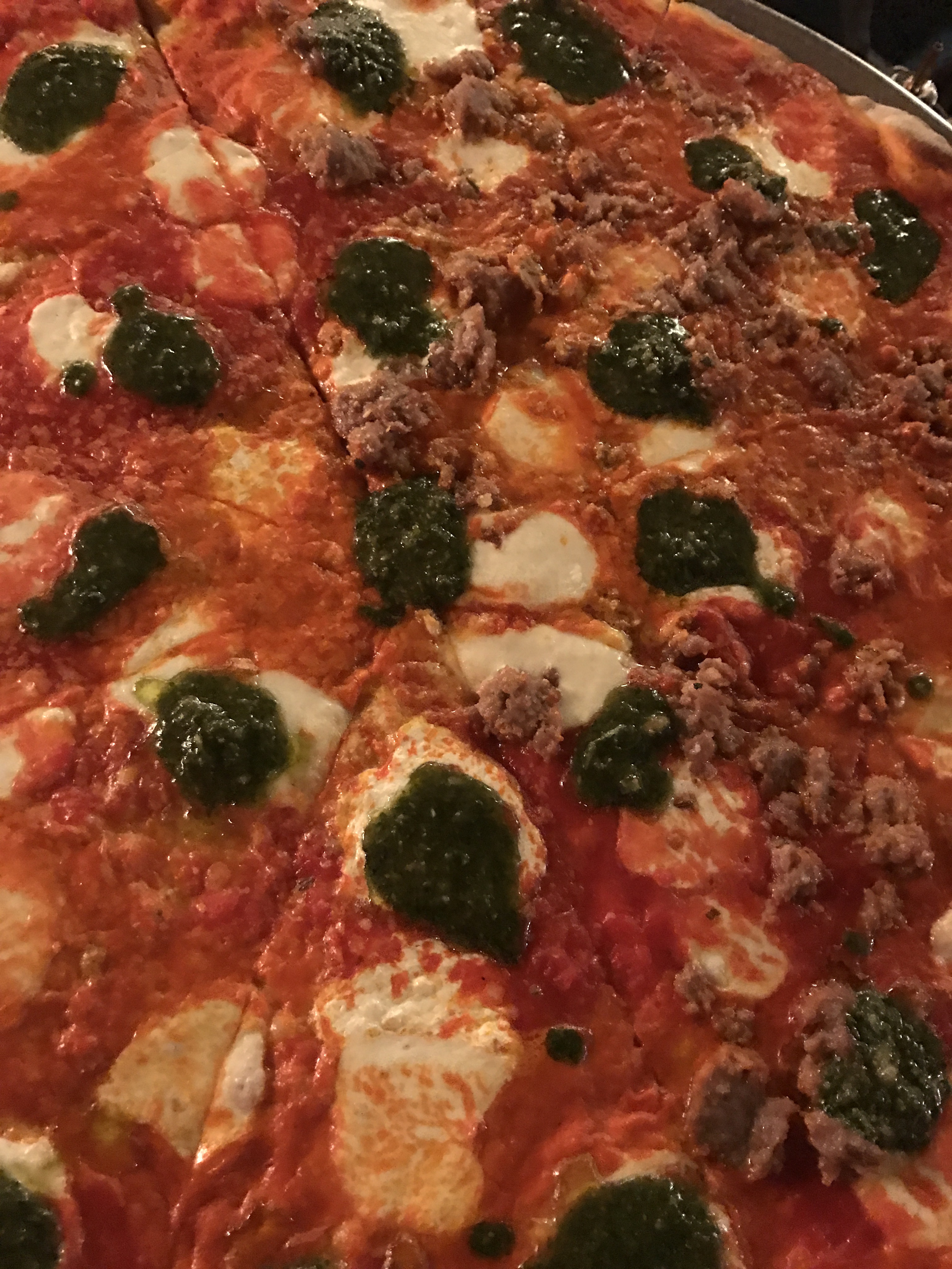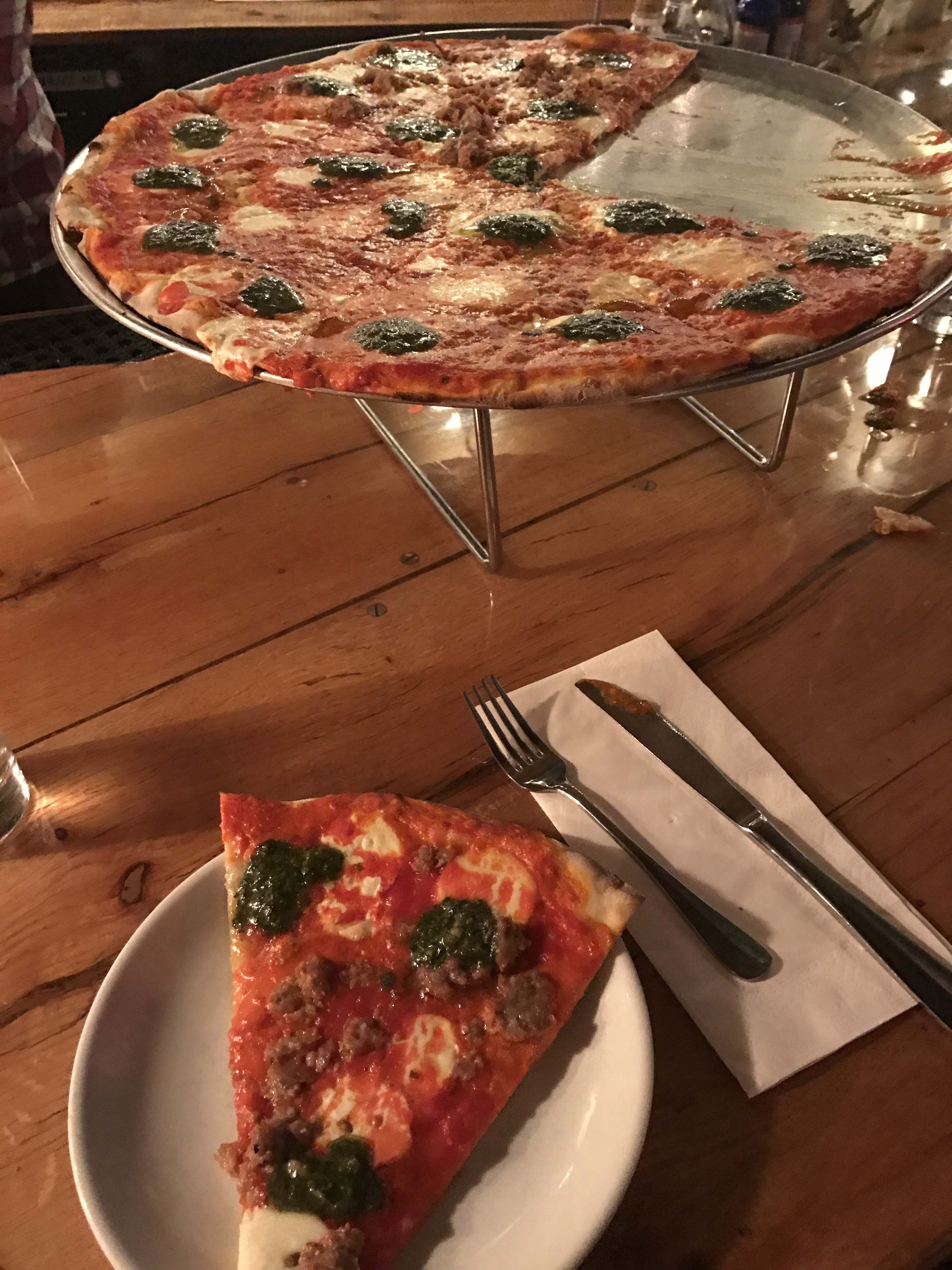 Ben and I have actually been here twice and we both agree that this place is utterly fantastic. It’s great for a date, for a dinner with your mom and her friend or for a large group. We shared the Tie Dye pizza with added sausage on top and both times it was incredibly mouthwatering. It’s both limber and juicy and can be a wee bit sloppy when you pick up the slices, but each bite is like a little piece of heaven. They almost melt in your mouth! I definitely recommend the Tie Dye pizza, which has just the right amount of cheesy goodness and the sauce is smooth and creamy. There’s also pesto on it and I’m literally addicted to pesto.