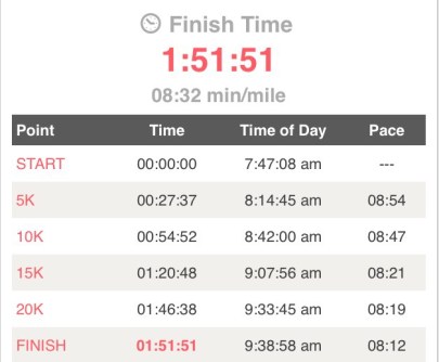 Humble brag: I’m so happy with my Airbnb Brooklyn Half Marathon results! Sorry, not sorry. I went in with the hopes of 1) crossing the finish line on two feet and not on all fours and 2) if upright on two feet, beating my personal record of 1:59:24. I ended up succeeding in both, finishing at 1:51:51 (8,069th overall and 2,218th among the women) AND physically well enough to wait on line for an hour just for a hot dog and MASSIVE beer at Nathan’s immediately following. #Priorities. Here are my stats, and considering I started in the second wave running an estimated 9:30 mile, I’m really happy with how I made out: