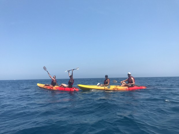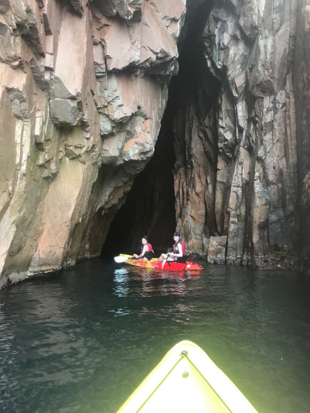 The kayaking trip itself was pretty rigorous at times, but overall SO fun! The gorgeous views and crystal clear water made up for the tumultuous spots. Seriously, at times the water got so rough, I didn’t think my arms could possibly row through it any longer. It was totally worth the workout, and now I have biceps of freakin’ STEEL. My favorite part of our kayaking extravaganza was jumping off the kayaks into the water (and the many failed attempts at boomerangs). I was patting myself on the back, though, because the water was SOO DEEP and you could see fish below. EEK. There were also tons of other kayakers out there and lots of boats docked in some of the coves we went through, which was pretty cool to see.