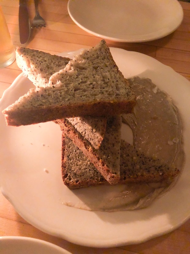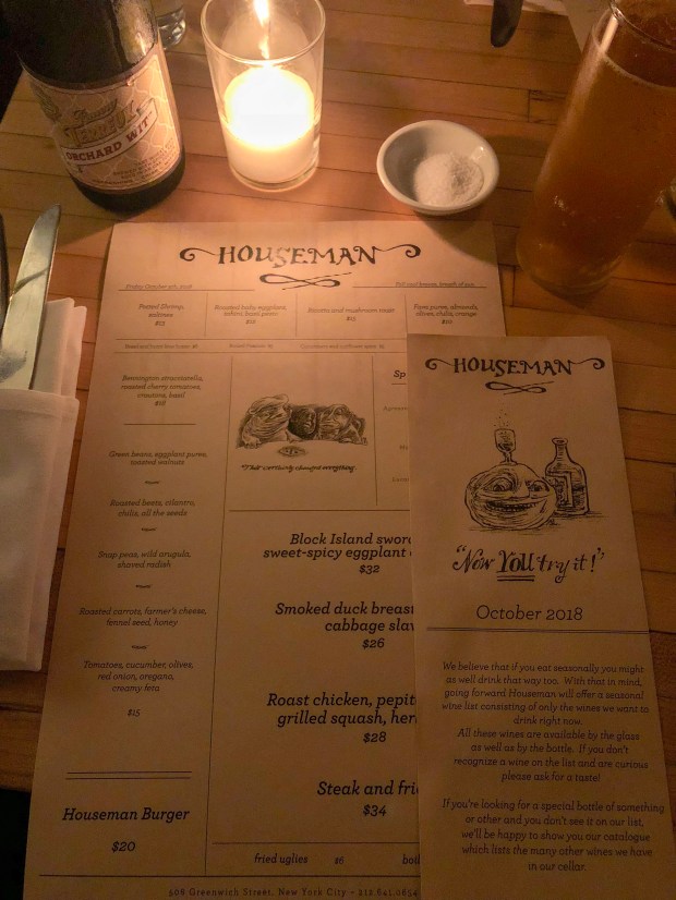 The menu at Houseman changes daily, and to prove it, they post the date and weather on top of every menu. While you can expect to see a staple like the Houseman Burger, some of the other dishes might change on any given day. Some of the menu options last night sounded AMAZING, like the Ricotta and Mushroom toast or the Roasted Baby Eggplant with tahini, and basil pesto. NOMZ. We opted to try the bread and lemon butter to have something easy to pick on without totally filling us up before the burger. As you can see, Houseman offers up a small, simple menu, which I completely appreciate. Even the beer list is small, but the single draft beer was really good and I LOVED the tart wheatbeer I ended up with.
