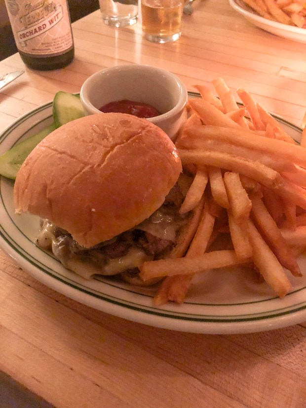 And now… drumroll please… the Houseman Burger. Anyone that knows me knows that I LOVE a good burger. A great burger. They have to be cheesy; they definitely have to be messy; and they have to be jam packed with flavor. I think the Houseman Burger totally stacks up, being that it’s actually stacked with two patties, covered in Swiss cheese, and topped with caramelized onions and mushrooms.