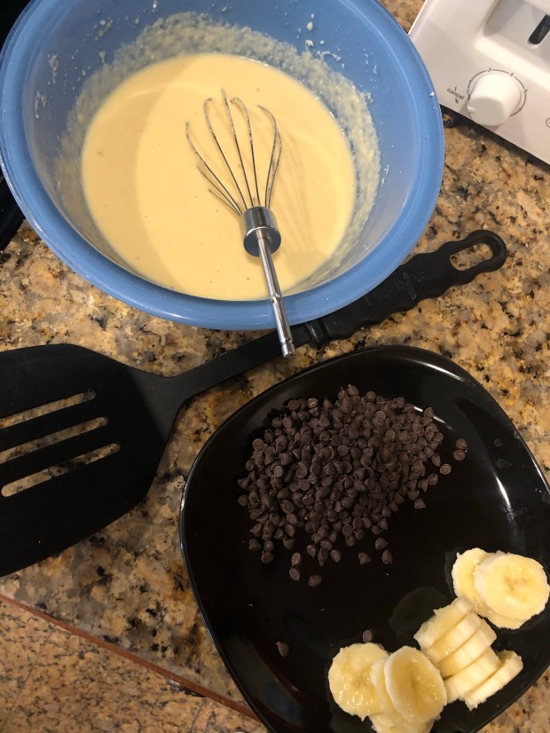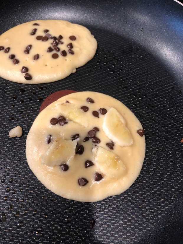 I know there are thousands of (more advanced) iterations for this recipe on the interwebs, but I wanted to throw together a recipe that would incorporate ingredients I already had in my kitchen, and which would require as few ingredients as possible. I know everyone’s household stash is going to look a bit different, but here’s what I had on deck: almond flour (left over from the cauliflower buffalo wings I’ve been making), almond milk, eggs, agave syrup (something I randomly picked up a while back), and maple syrup. After my initial test run, I realized I wanted to step it up with the added luxury of chocolate chips and bananas to give them some extra sweetness and flavor. Otherwise, this recipe can be a bit bland.