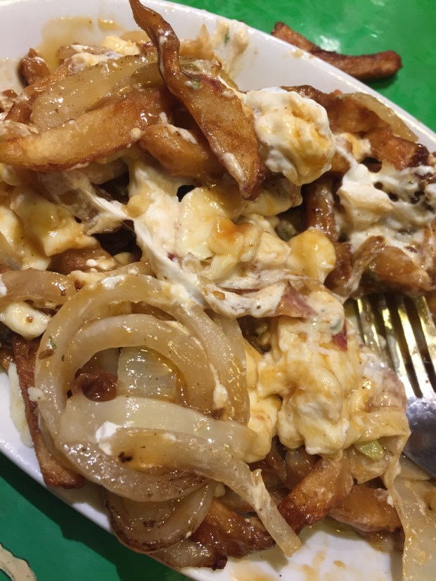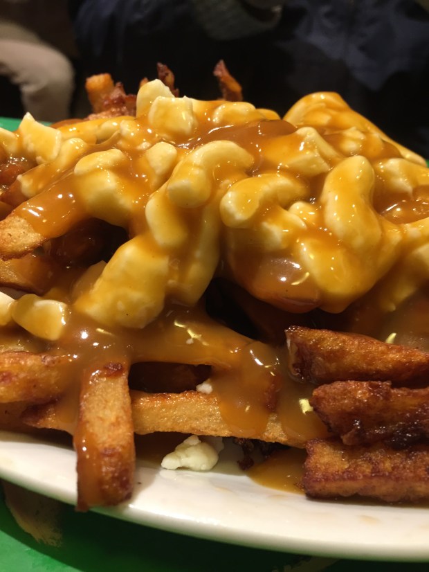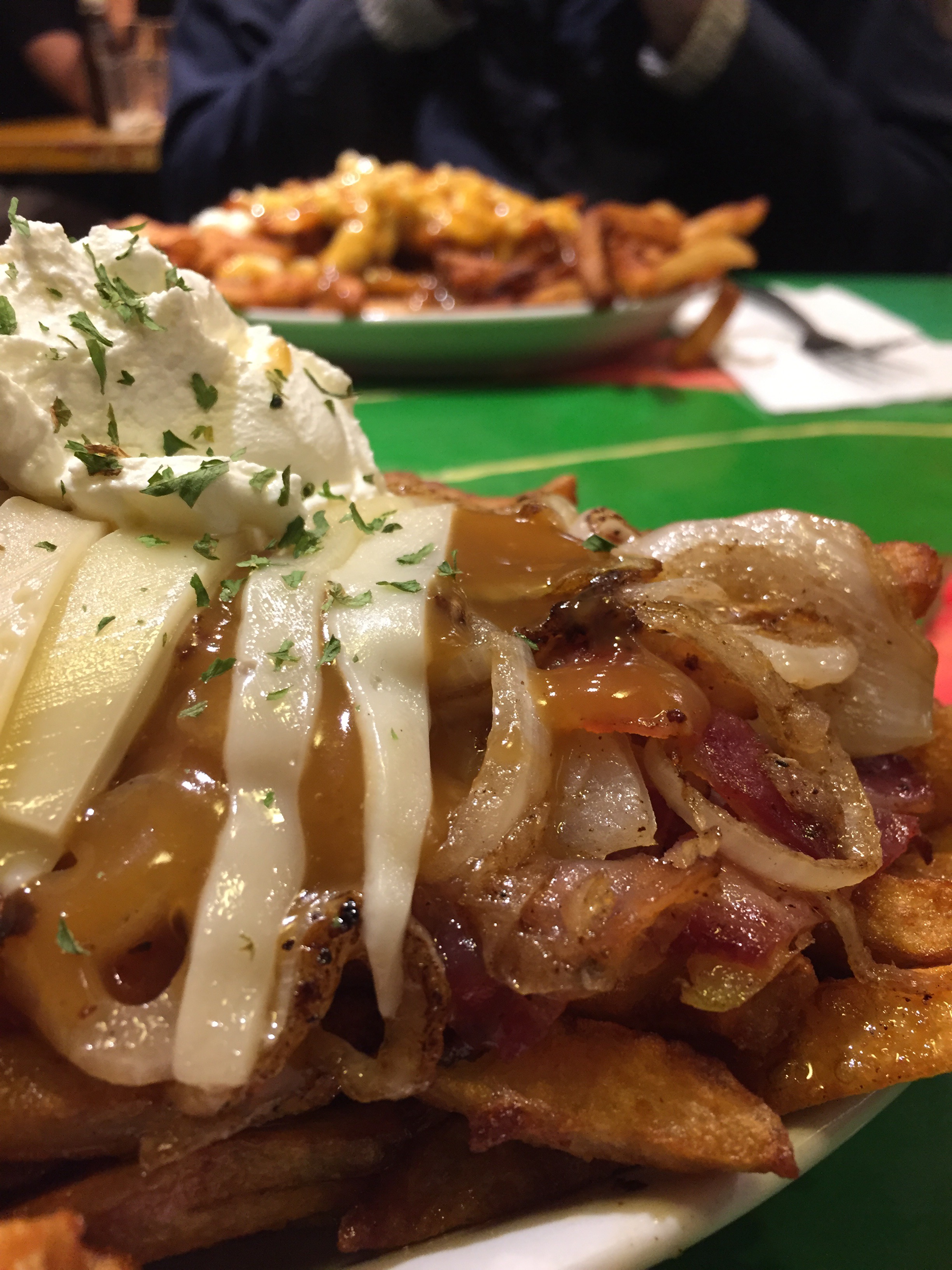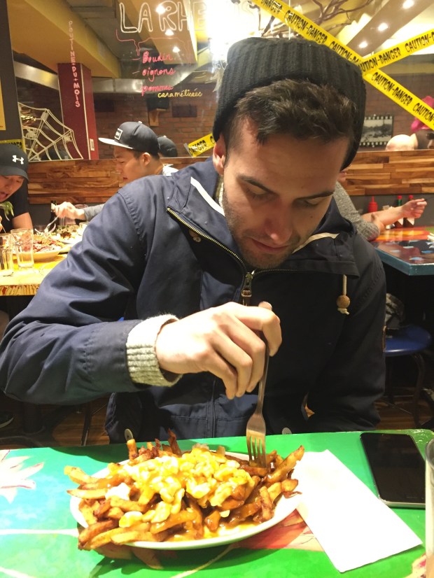 We had to wait about 40 minutes in the rain to get in to La Banquise, but it was worth it for both the grub and the whole experience. The building itself is super funky on the outside and the inside is vibrant thanks to the bright colored tables and the bumpin’ music. If my pictures have turned you off and you don’t think Poutine is your thing, you can still tag along with your friends at La Banquise as the restaurant has a huge menu consisting of burgers and other items. It’s also open 24-hours, so get ready to get your grub on at any time! Poutine-a-palooza!